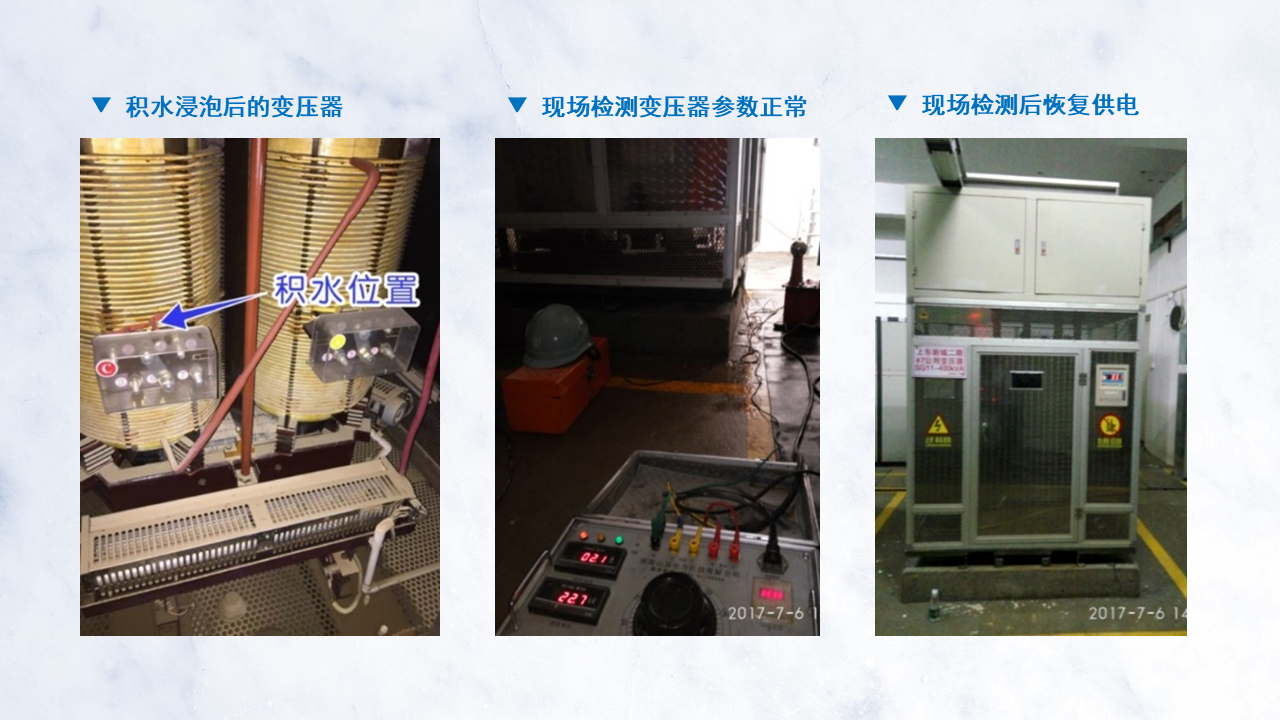 受暴雨影響,配電房受洪水浸泡,10台變敞開幹變已被水浸到達高壓分接檔位,造成小區供電中斷。經簡單處理後,現場檢測各項指標正常,可立即恢複正常供電。