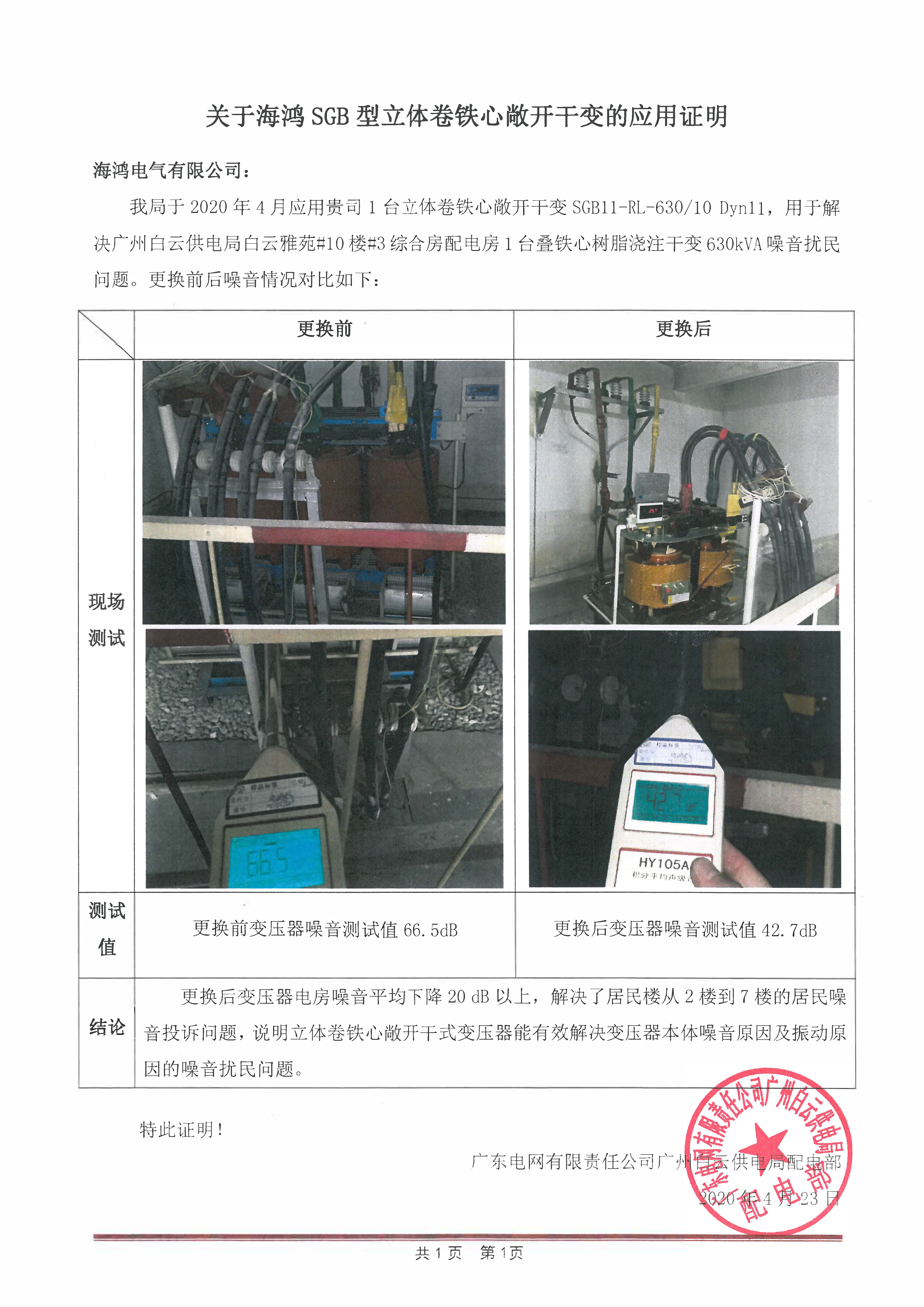 該局於2020年4月應用貴司1台立體卷鐵心敞開幹變SGB11-RL-630/10 Dyn11,用於解決廣州白雲供電局白雲雅苑#10樓#3綜合房配電房1台疊鐵心樹脂澆注幹變630kVA噪音擾民問題。更換後變壓器電房噪音平均下降20dB以上,解決了居民樓從2樓到7樓的居民噪音投訴問題,立體卷鐵心敞開幹式變壓器能有效解決變壓器本體噪音原因及振動因的噪音擾民問題。