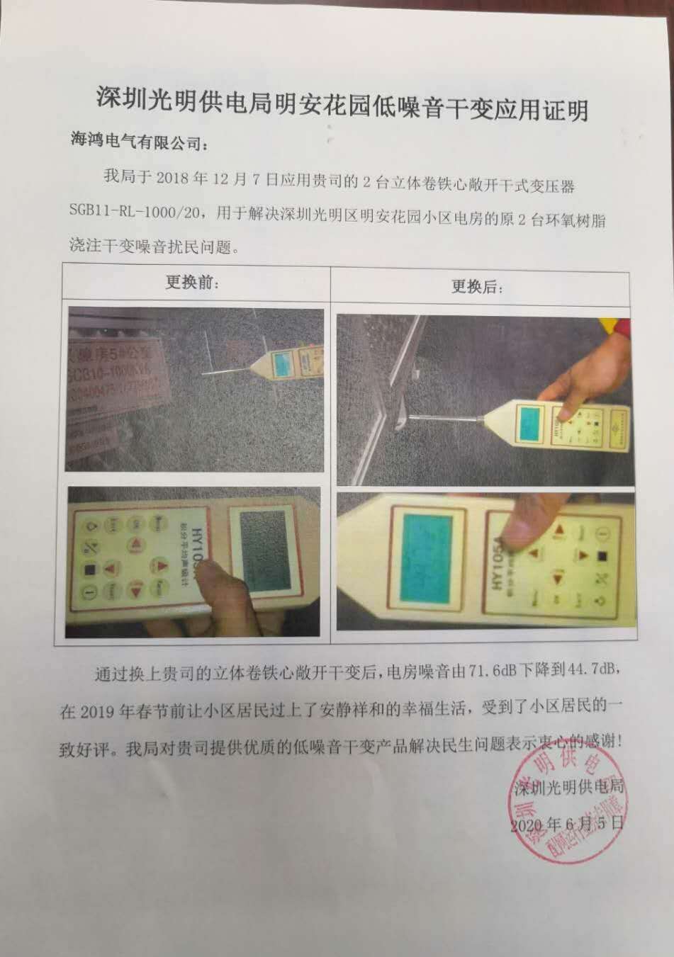 2018年12月7日深圳市光明區明安花園因小區電房原2台環氧樹脂澆注幹變噪音擾民,而更換海鴻電氣兩台SGB11-RL-1000/20敞開式立體卷鐵心幹式變壓器。海鴻電氣產品安全可靠、寧靜運行的優勢讓明安花園重獲安靜祥和,並得到小區居民與深圳光明供電局高度認可。