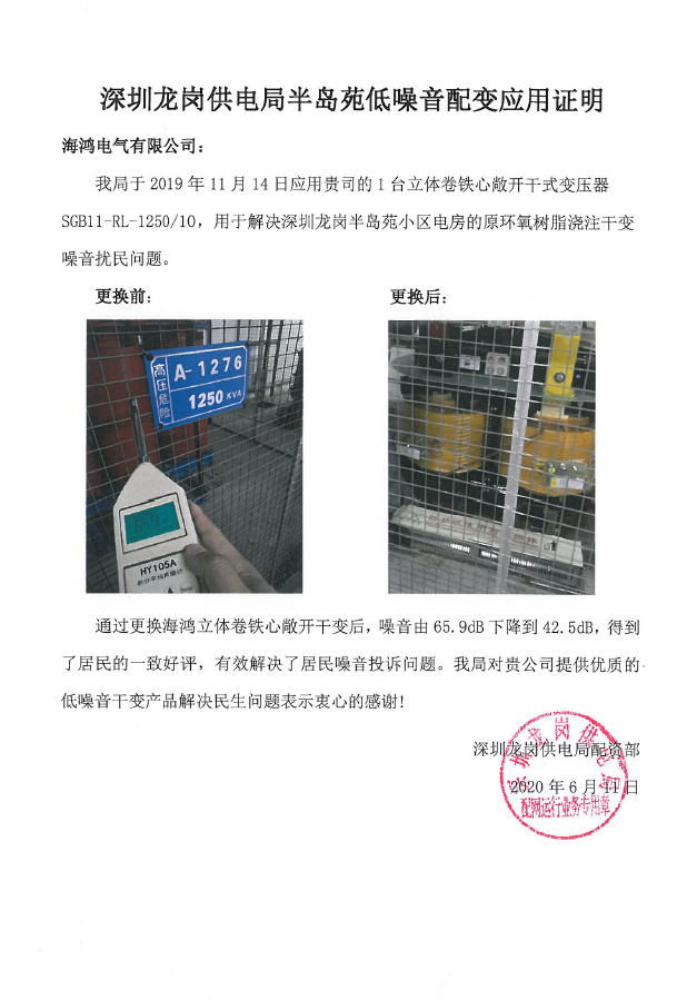 深圳龍崗區半島苑小區電房內的環氧樹脂澆注幹變噪音大影響居民休息。深圳龍崗供電局采用海鴻電氣SGB11-RL-1250/10敞開式立體卷鐵心幹式變壓器與其更換,更換後,小區電房噪音由65.9分貝下降到42.5分貝,成功解決小區噪音擾民問題。 海鴻電氣敞開式立體卷鐵心幹式變壓器運行噪音低,非常適用於居民區配電。