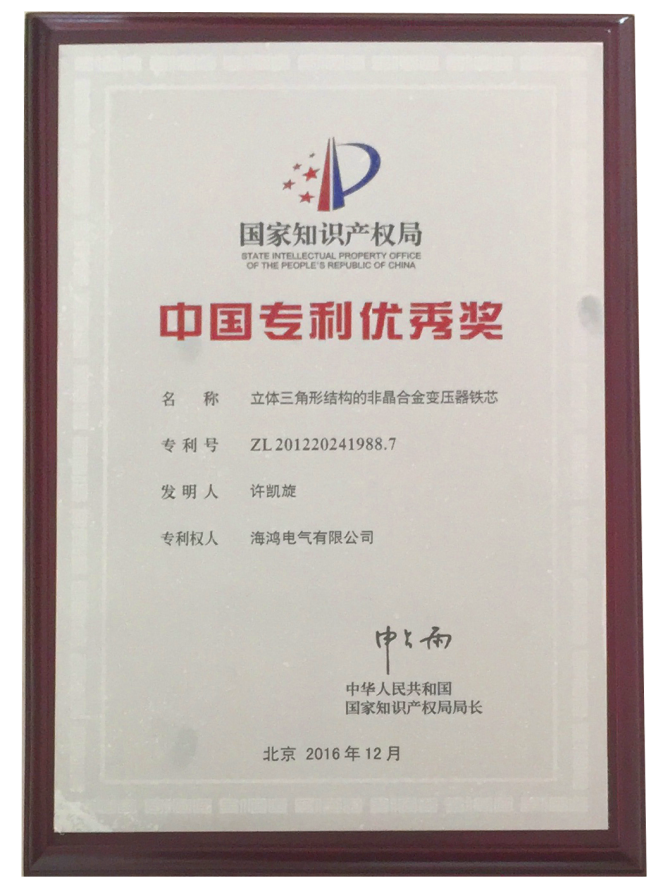 近期,海鴻電氣有限公司收到了國家知識產權局頒發的《中國專利優秀獎》證書。公司自主研發的立體三角形結構的非晶合金變壓器鐵芯獲此殊榮。中國專利獎是國家為鼓勵和表彰專利權人和發明人(設計人)對技術(設計)創chuang新xin及ji經jing濟ji社she會hui發fa展zhan所suo做zuo的de突tu出chu貢gong獻xian而er設she立li,中zhong國guo專zhuan利li獎jiang評ping選xuan工gong作zuo由you國guo家jia知zhi識shi產chan權quan局ju與yu世shi界jie知zhi識shi產chan權quan組zu織zhi共gong同tong開kai展zhan,每mei年nian舉ju辦ban一yi屆jie,從cong專zhuan利li質zhi量liang、技術先進性、運用及保護措施和成效、社會效益及發展前景等方麵進行評選。此次海鴻電氣獲此殊榮標誌著國家對海鴻自主研發非晶合金立體卷鐵心新穎、創造性、先進性的認可,更是對海鴻自有技術知識產權的所有權的充分肯定。