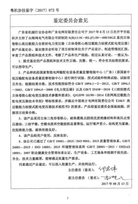 8月13日,由廣東省機械行業協會和廣東電網有限責任公司共同組織的海鴻產品鑒定會議順利召開。海鴻電氣自主研製的“立體卷鐵心高過載能力全密封電力變壓器”等六個係列產品全部通過鑒定,並獲得鑒定專家的高度認可和讚賞。