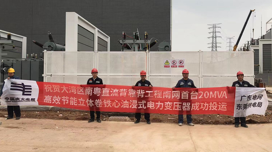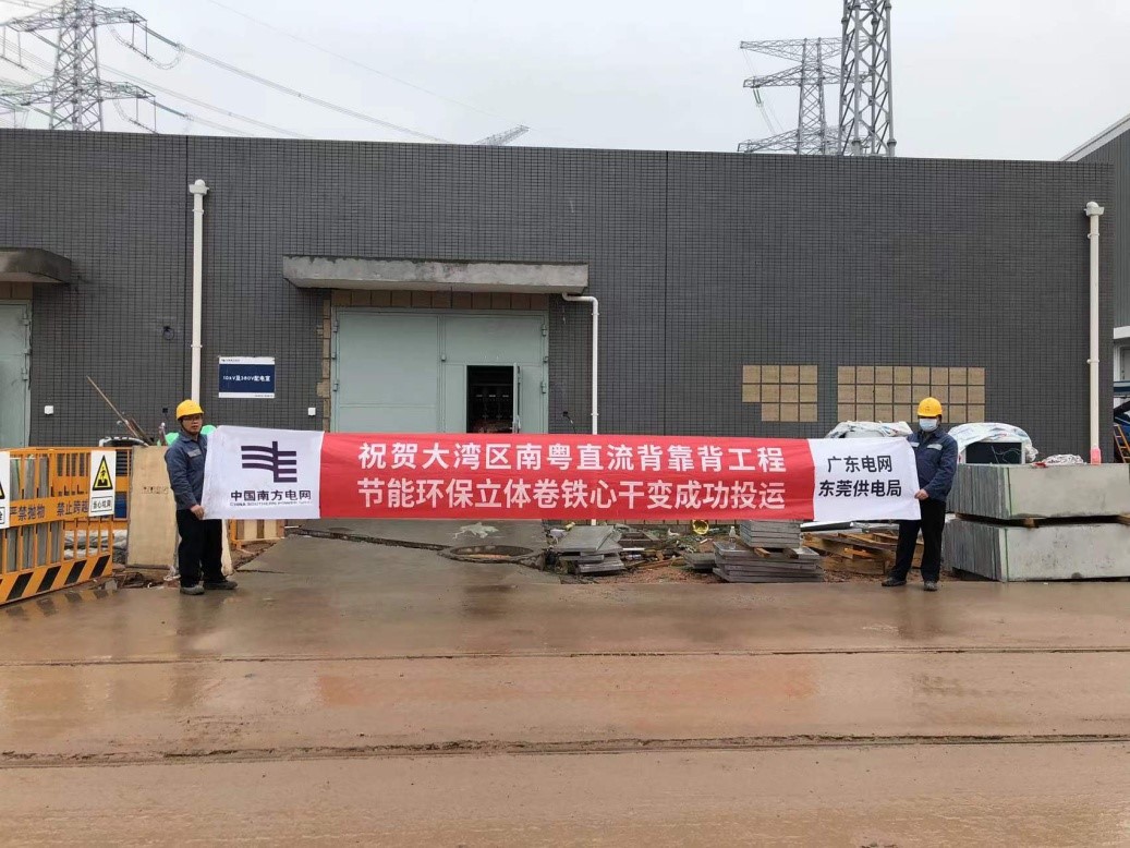 2021年12月25日廣東電網直流背靠背東莞工程(大灣區南粵直流背靠背工程)  交流場首次投運,由海鴻電氣有限公司供貨的南網首台20MVA高效節能立體卷鐵心油浸式電力變壓器成功投運,計劃首批通電的3150kVA節能環保立體卷鐵心幹式變壓器也成功投運。