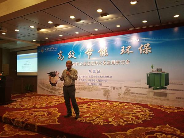 4月21日ri下xia午wu,為wei普pu及ji高gao效xiao節jie能neng設she備bei的de使shi用yong,推tui動dong高gao效xiao節jie能neng配pei電dian變bian壓ya器qi的de應ying用yong和he發fa展zhan,東dong莞guan市shi經jing信xin局ju聯lian合he海hai鴻hong電dian氣qi有you限xian公gong司si在zai東dong莞guan會hui展zhan國guo際ji大da酒jiu店dian,召zhao開kai“配電變壓器能效提升暨高效節能環保立體卷鐵心變壓器技術及運用研討會”。來自東莞市供電局、設計院、地產公司、電力安裝公司和大型用戶近200人參加此次會議。