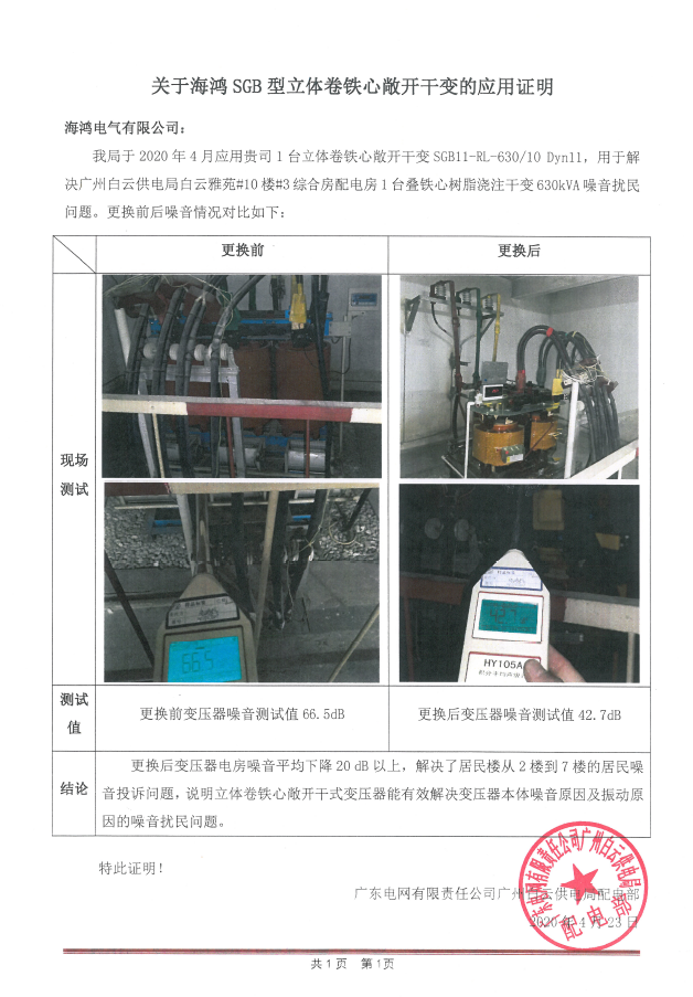 廣州白雲區白雲雅苑10樓綜合配電房內一台630kVA的疊鐵心樹脂澆注幹變噪音過大,嚴重影響2-7樓居民日常休息。廣州白雲供電局選用海鴻電氣SGB11-RL-630/10敞開式立體卷鐵心幹式變壓器進行更換,更換後配電房噪音水平從66.5分貝降到42.7分貝。敞開式立體卷鐵心幹式變壓器結構堅固穩定,有效解決變壓器器身噪音原因及振動引起的噪音問題。