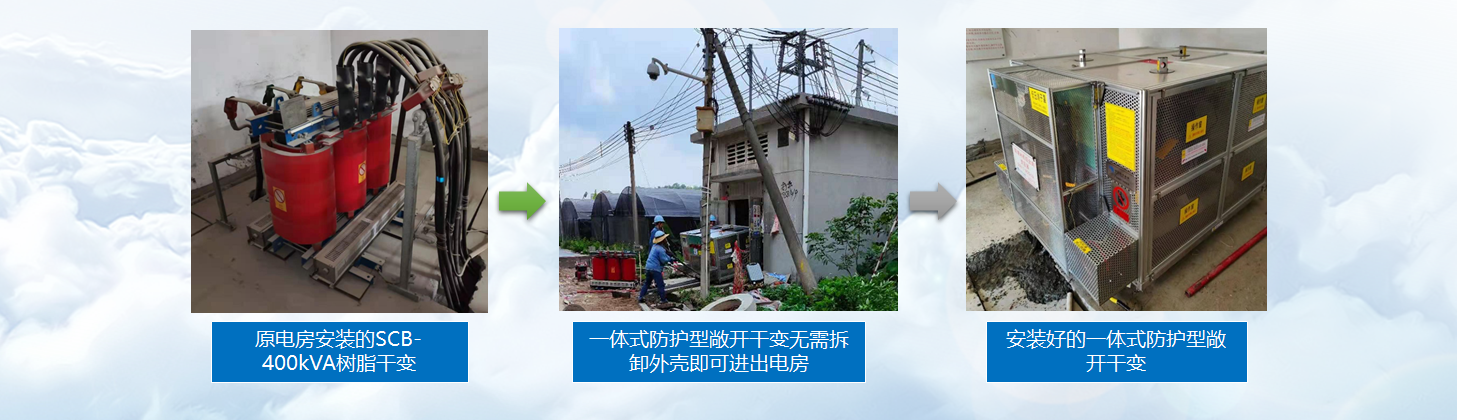 4、項(xiang)目(mu)實(shi)現(xian)了(le)幹(gan)變(bian)運(yun)行(xing)過(guo)程(cheng)中(zhong)不(bu)停(ting)電(dian)更(geng)換(huan)風(feng)機(ji),有(you)效(xiao)降(jiang)低(di)電(dian)網(wang)停(ting)電(dian)考(kao)核(he)率(lv)。一(yi)體(ti)式(shi)防(fang)護(hu)型(xing)敞(chang)開(kai)幹(gan)變(bian)外(wai)殼(ke)體(ti)積(ji)小(xiao),無(wu)需(xu)拆(chai)卸(xie)外(wai)殼(ke)即(ji)可(ke)進(jin)出(chu)電(dian)房(fang),安(an)裝(zhuang)更(geng)方(fang)便(bian),並(bing)且(qie)在(zai)安(an)裝(zhuang)過(guo)程(cheng)為(wei)變(bian)壓(ya)器(qi)提(ti)供(gong)有(you)效(xiao)防(fang)護(hu)。