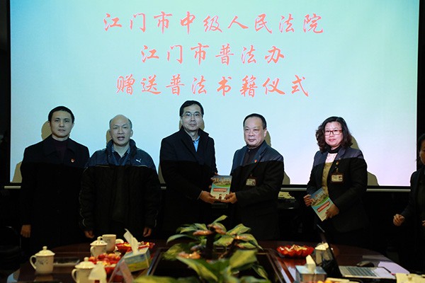 贈書活動在海鴻電氣翠山湖總部會議室舉行,江門市中級人民法院林慕恒副院長、機關黨委王堅副書記、綜合辦公中心李朝衛主任,江門市司法黨委委員黃宇光,開平市法院曹富榮院長、梁穎文副院長,海鴻電氣許凱旋董事長、翟麗珍總經理、黨支部委員鄭玲、何綺玲等出席了此次贈書活動。