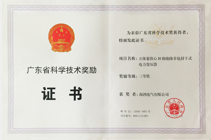 2018年4月19日,江門市科技創新大會在江門市政府召開,會上表彰了2017年廣東省科學技術獎獲獎單位,海鴻電氣自主創新研發的“立體卷鐵心H級絕緣非包封幹式電力變壓器”項目榮獲廣東省科學技術獎三等獎。