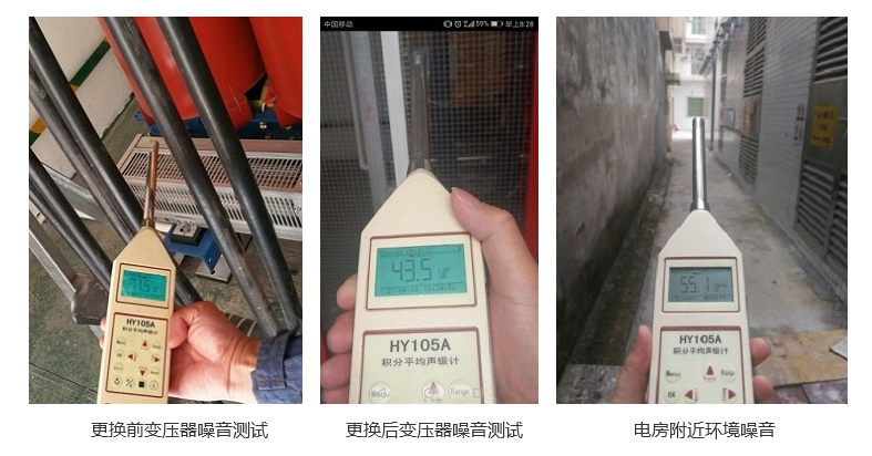 今年4月份,售後服務人員前往番禺石基所進行了變壓器的更換工作,並測試了更換前後變壓器的噪音。如下圖所示: