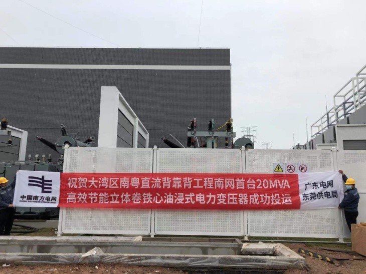2021年12月25日廣東電網直流背靠背東莞工程(大灣區南粵直流背靠背工程)  交流場首次投運,由海鴻電氣有限公司供貨的南網首台20MVA高效節能立體卷鐵心油浸式電力變壓器成功投運,計劃首批通電的3150kVA節能環保立體卷鐵心幹式變壓器也成功投運。