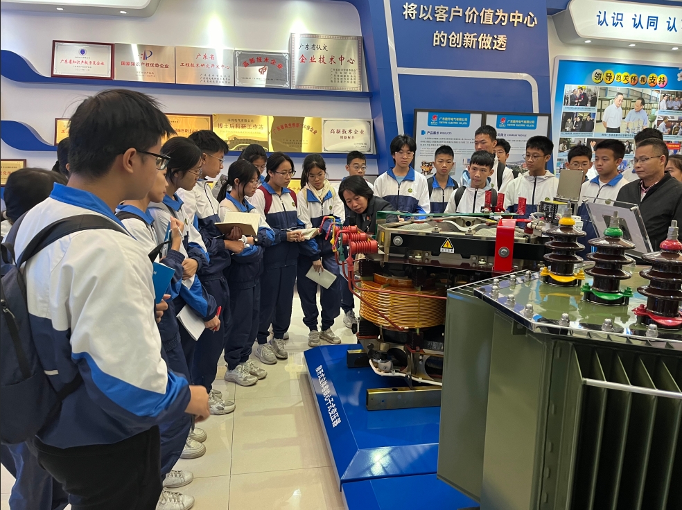 1月9號上午,開平市金山中學八年級拓展班110名學生和12名老師抵達海鴻電氣有限公司科普基地,參觀的學生和老師一共分為三批次,依次輪流參觀多功能展示廳、智能監控廳、電氣事業部車間、132kV項目部車間、以及集成一體式光儲充電站、立li體ti集ji成cheng模mo塊kuai鄉xiang村cun充chong電dian示shi範fan站zhan。在zai工gong作zuo人ren員yuan的de帶dai領ling下xia,一yi群qun青qing春chun洋yang溢yi的de初chu中zhong生sheng帶dai著zhe滿man臉lian期qi待dai,踏ta入ru了le這zhe個ge充chong滿man現xian代dai科ke技ji氣qi息xi的de空kong間jian,在zai他ta們men的de身shen旁pang,是shi同tong樣yang滿man懷huai熱re情qing的de老lao師shi,他ta們men此ci行xing的de目mu的de是shi為wei了le讓rang學xue生sheng們men近jin距ju離li感gan受shou科ke技ji的de力li量liang,激ji發fa他ta們men對dui科ke學xue技ji術shu的de興xing趣qu和he熱re愛ai。為wei了le讓rang師shi生sheng們men更geng好hao的de理li解jie變bian壓ya器qi、箱式變電站的工作原理及其重要性,技術講解員采用生動形象的語言結合實物演示的方式進行講解。
