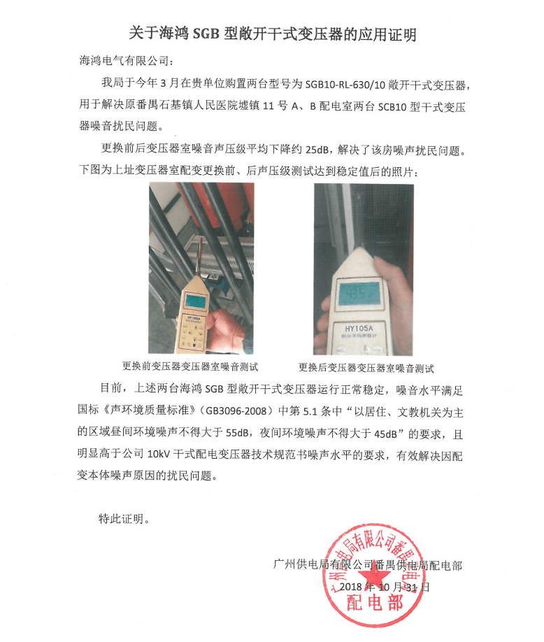 廣州市番禺區石基人民醫院是一家集醫療、保健、康複、健康教育、計劃生育技術服務於一體的綜合性“二級甲等”醫院。醫院原有變壓器噪音太大,嚴重影響就醫環境,影響醫生工作、病人休息,後采用海鴻電氣立體卷鐵心變壓器後,噪音由原來的77.5分貝下降到43.5分貝,杜絕噪音擾民的問題,且產品過載能力強、抗短路能力強滿足醫院高負荷用電需求。